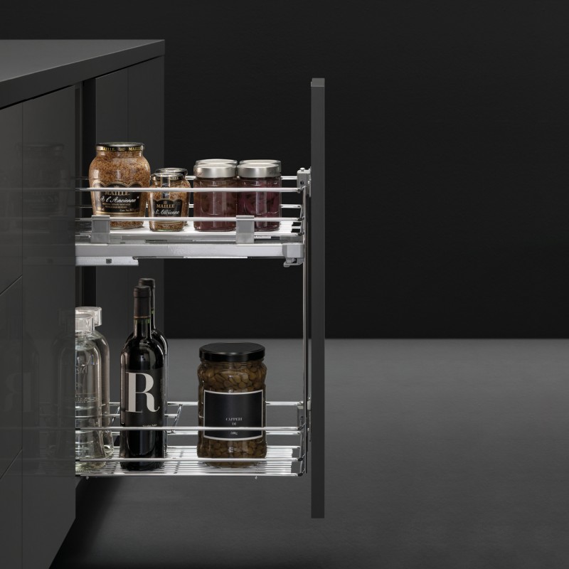 Το κάτω συρμάτινο καλάθι περιέχει μπουκαλοθήκη με σταθερά χωρίσματα για 4 μπουκάλια μέγιστης διαμέτρου 9.8 cm